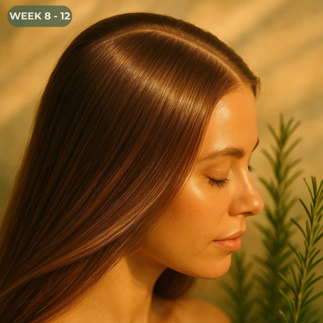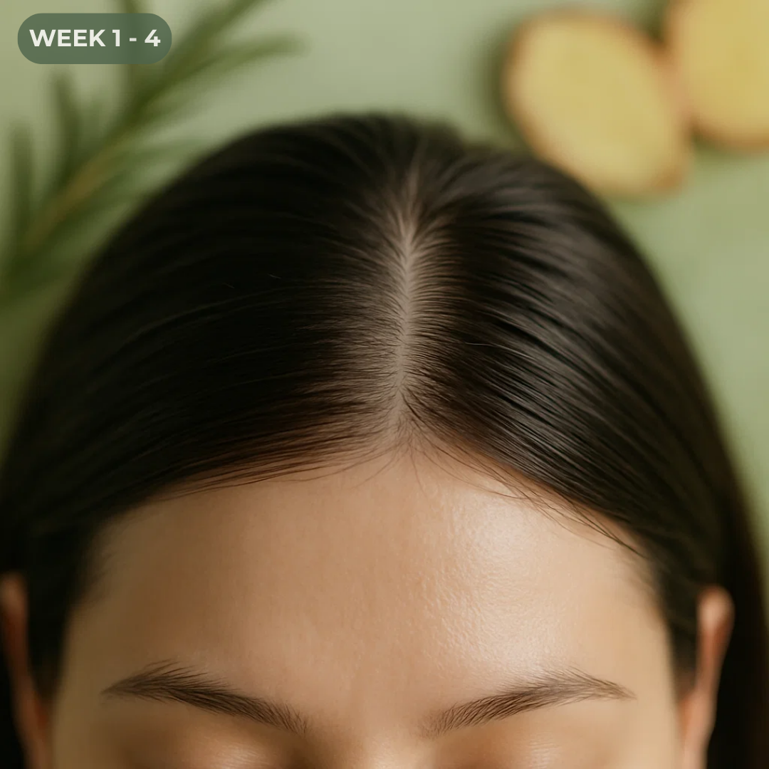 Your scalp begins its renewal. Rosemary and ginger gently stimulate circulation while clearing buildup that can block growth. The foundation for healthy hair is set.
