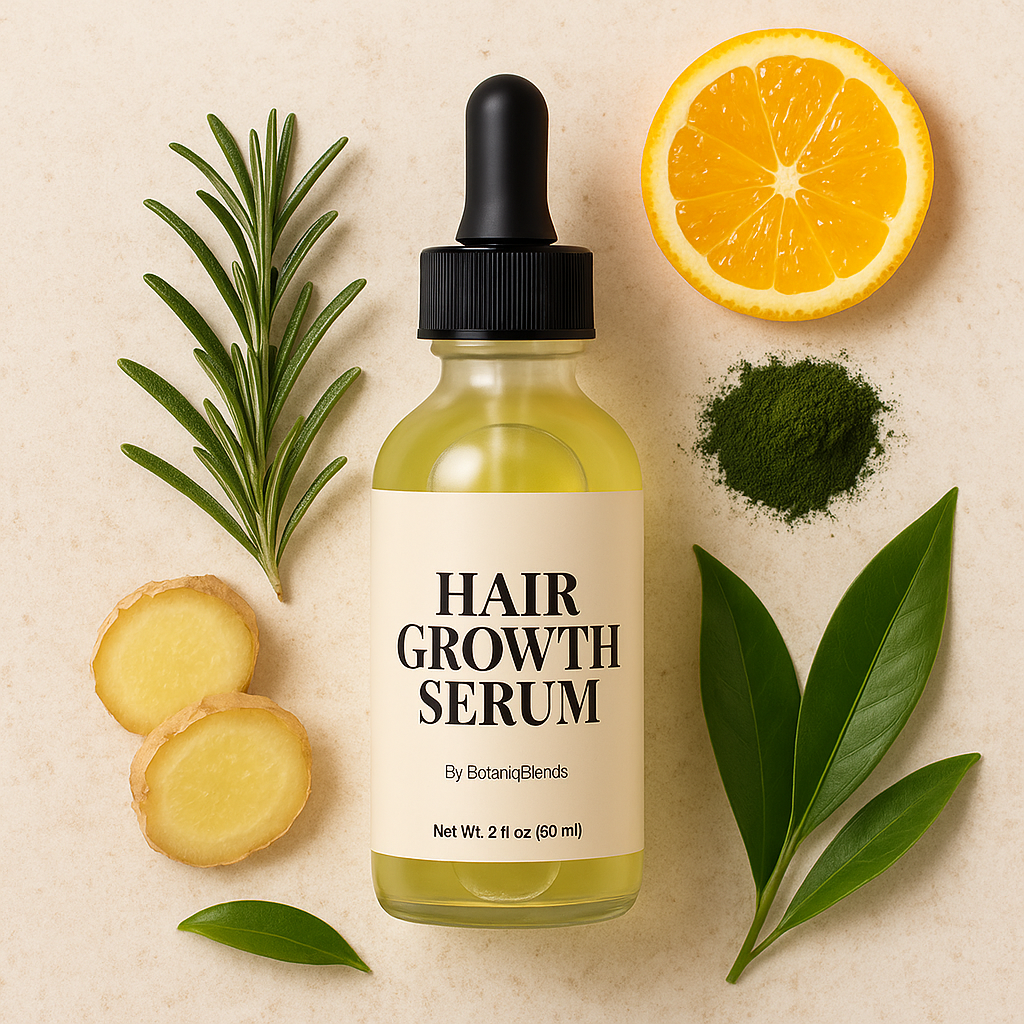 Naturally nourish, strengthen, and restore your hair — from the roots up. The Botanical Hair Growth Serum by BotaniqBlends is crafted to unlock your hair’s full potential with a carefully selected blend of nature’s most effective ingredients. Infused with rosemary extract to support scalp circulation and enhance overall vitality, and enriched with ginger root to deeply nourish and refresh, this lightweight serum works to promote visibly fuller, healthier-looking hair.At the heart of the formula lies Densidyl®, a powerful botanical complex combining chlorella emersonii and spirulina maxima extracts. Together with vitamin C and vitamin E, this blend delivers intense hydration and antioxidant protection, helping to create the ideal environment for healthy, balanced scalp conditions and long-term growth support.The serum absorbs quickly into the scalp without leaving any residue, making it an effortless addition to your daily hair care routine. Gentle, effective, and suitable for all hair types, it offers a clean, refreshing experience that brings both your scalp and your strands back to life — naturally.