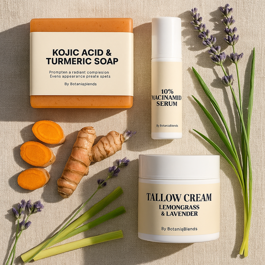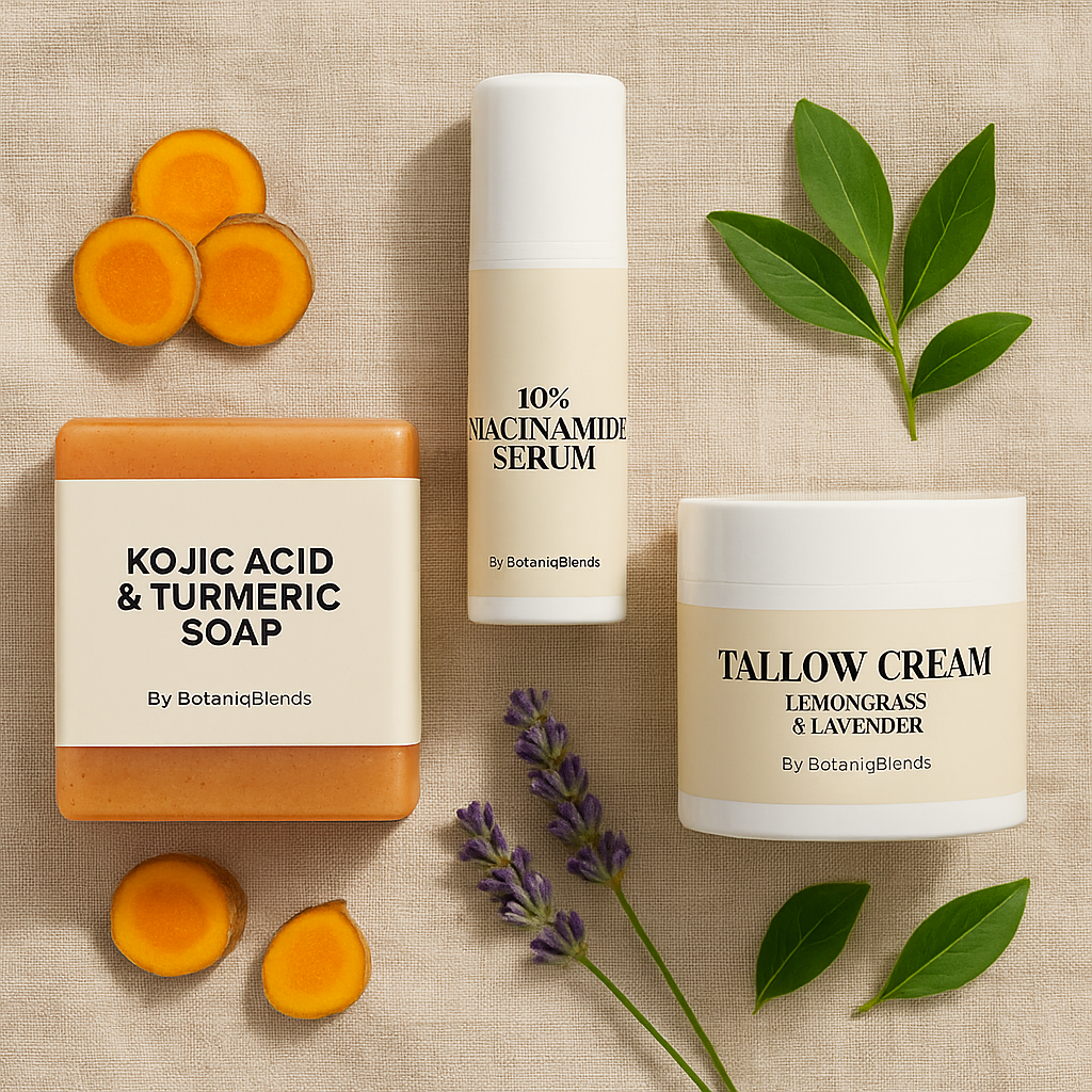 The Clear & Calm Skin Kit is a complete 3-step routine that cleanses, brightens, and deeply nourishes for a smoother, clearer, and more radiant complexion. Combining the Kojic Acid & Turmeric Soap, the 10% Niacinamide Serum, and the Tallow Cream, this kit helps refine texture, even the look of skin tone, calm visible redness, and lock in long-lasting hydration—gentle enough for daily use and suitable for most skin types.