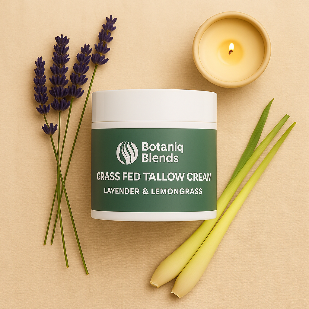 Our Tallow Cream with Lemongrass & Lavender is a deeply nourishing moisturizer crafted from 100% natural, grass-fed beef tallow. Rich in vitamins A, D, E, and K, this cream delivers long-lasting hydration while supporting skin vitality and repair. Its unique blend closely mimics the skin’s natural oils, making it especially suitable for dry, stressed, or sensitive skin.Infused with the calming aroma of lavender and the refreshing notes of lemongrass, it not only soothes and softens but also turns your skincare routine into a relaxing self-care ritual. Free from synthetic additives and preservatives, it’s the perfect choice for anyone seeking a pure and effective skincare solution.